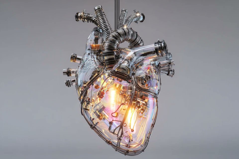 Detailed skeletal structures of subjects with glowing internal gear systems and machinery.