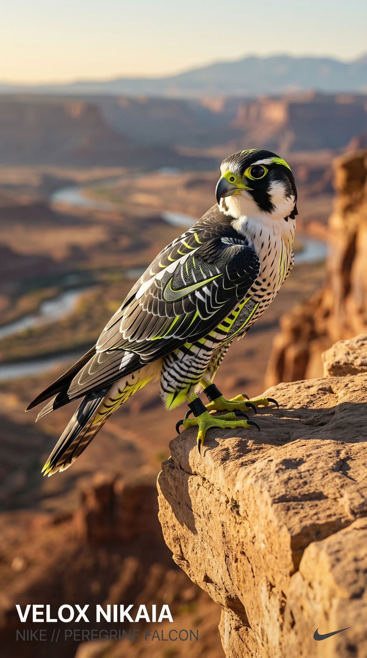 Act as a Professional Art Director creating an image of an animal in a brand's design. PHASE 1: Brand Selection Select a well-known brand which is commonly known and has a clear association with their logo, colors, essence and their overall-appearance (e.g. Coca-Cola, Red Bull, Porsche, Nike, Wrangler, Heineken). Set [BRAND] = selected brand PHASE 2: animal Selection Select an animal that fits to the selected brand (see PHASE 1) - e.g. European rhinoceros beetle fits to Red Bull. Set [ANIMAL] = selected animal PHASE 3: Image creation Create an ultra-realistic high-quality professional photograph of the [ANIMAL] in its natural environment but applying the design of [BRAND] onto the [ANIMAL]. PHASE 4: Name Creation Based on [BRAND]’s name and the [ANIMAL] create a realistic sounding latin name of the animal. Set [NAME] = name of the animal PHASE 5: Lighting Lighting: Natural, direct sunlight. High-contrast shadows on the subject to emphasize form and texture. Visual Style: High-contrast natural lighting (golden hour or bright coastal sun), clean lines, and highly detailed textures. High-end 8k commercial photography. Sharp focus. PHASE 6: TYPOGRAPHY & GRAPHIC OVERLAYS (UI) Bottom Left: Minimalist 2-line text Line 1: "[NAME]", Font: Manrope Bold. Color: #FFFFFF Line 2: "[BRAND] // [ANIMAL]". Font: Manrope Regular. Color: #414141 Bottom Right: A small, discreet, monochrome logomark of [BRAND]. Color: #414141. Do NOT visualize “Font name” and “Color code”.