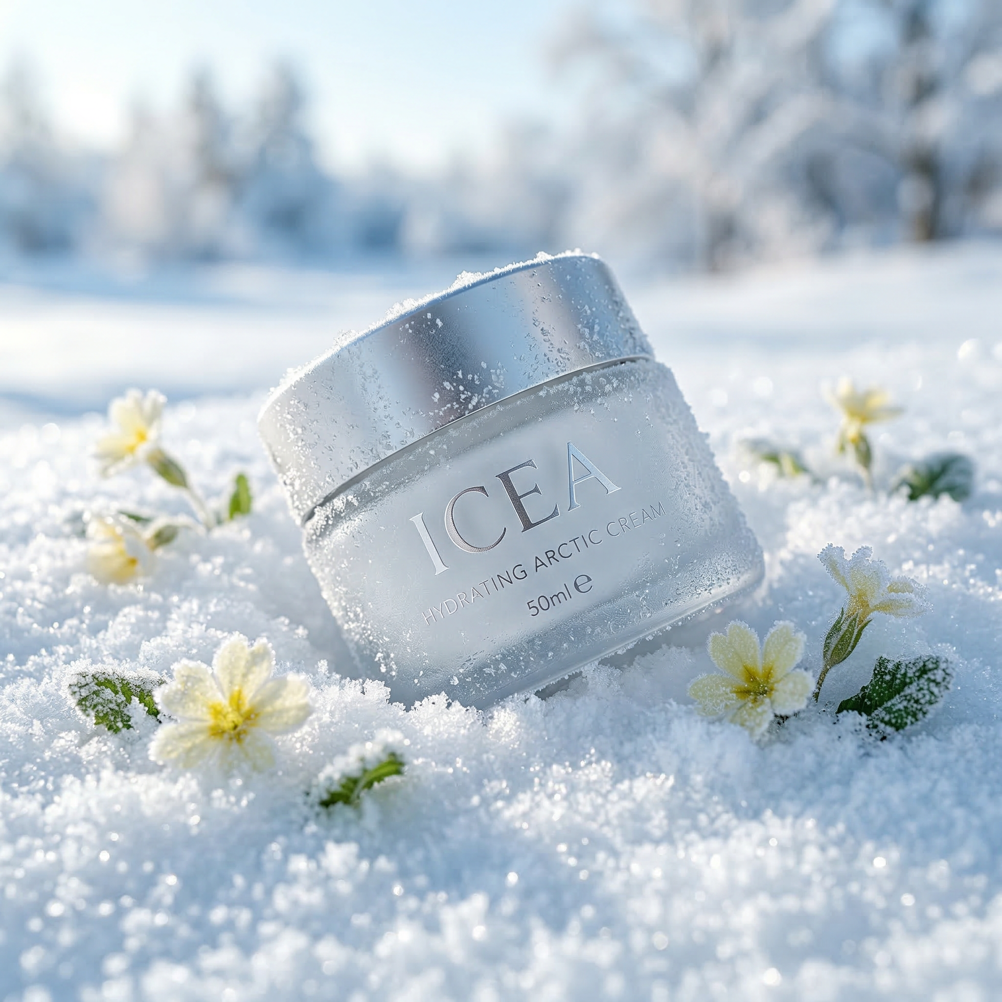 Generate premium cosmetic jars nestled in frost-covered snow with delicate winter flowers.
