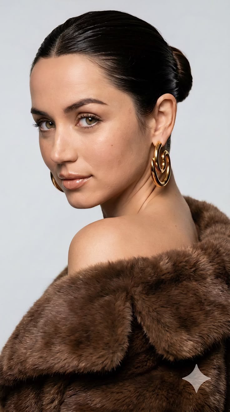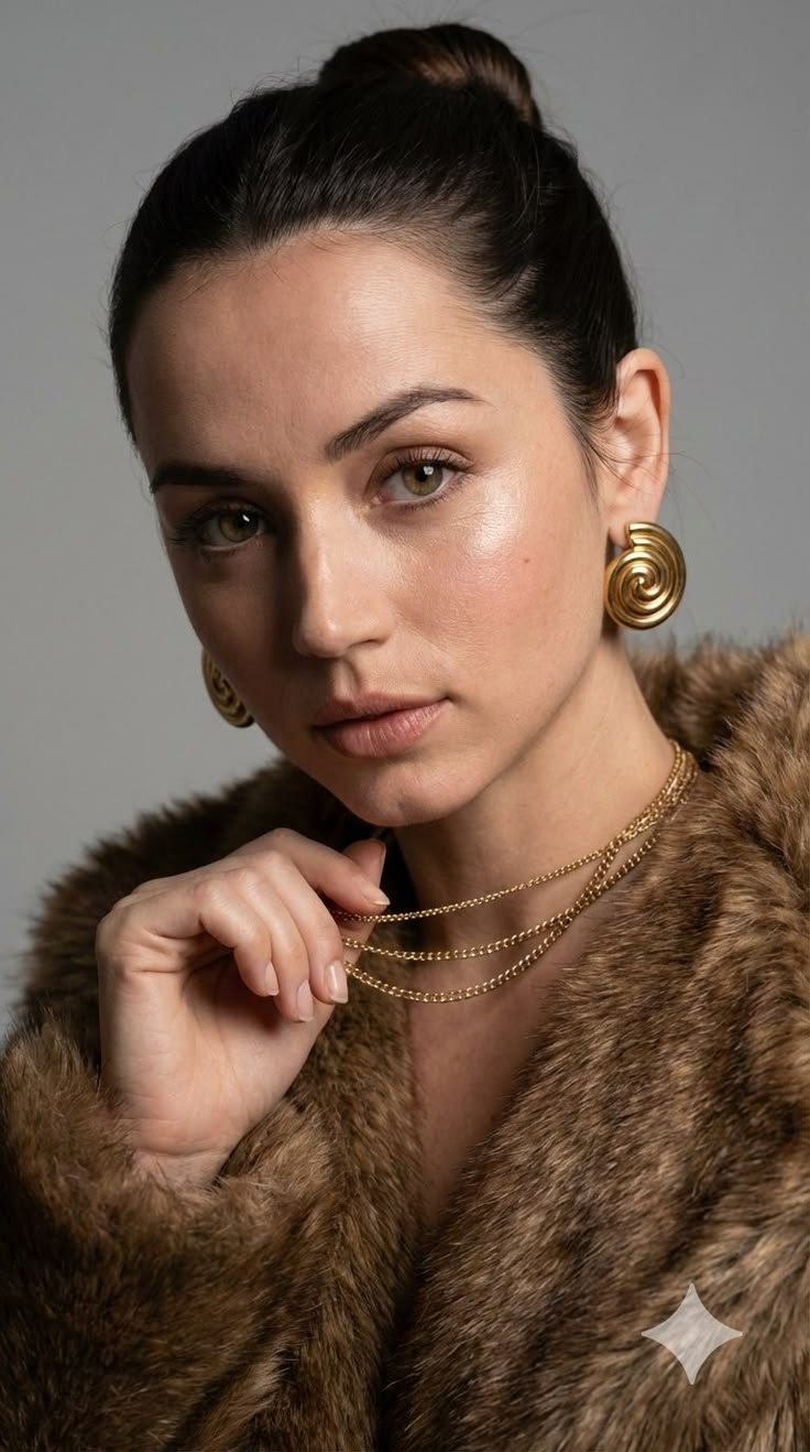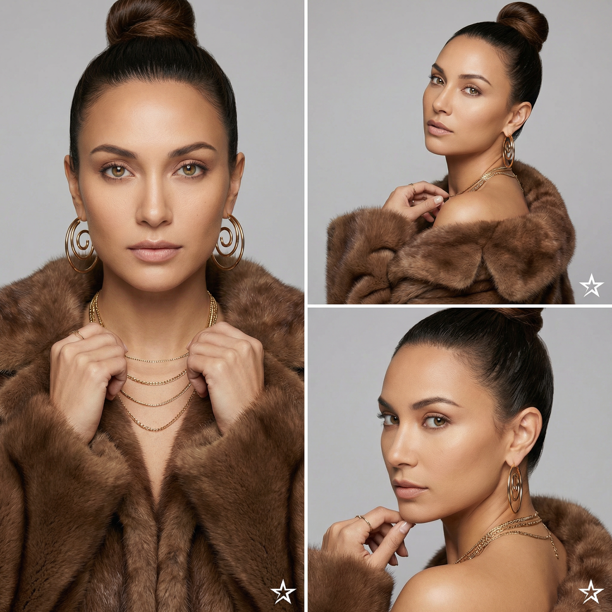 Create elegant fashion editorial portraits featuring luxurious fur coats and bold gold jewelry.